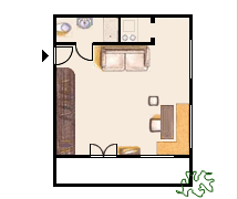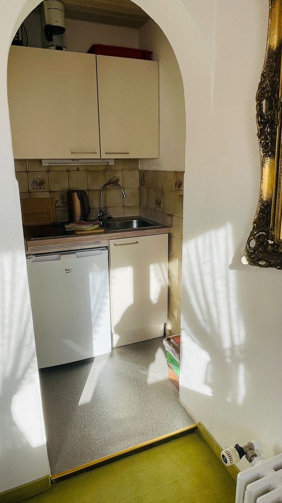Das Appartement ist ein großes Wohn-/Schlafzimmer (SW-Eckzimmer) im 1. OG mit Balkon. Die Wohnung hat eine Schrankwand, darin sind die Betten zum herausklappen, sowie eine Schlafcouch für weitere Personen und einer gemütlichen Essecke. Es verfügt über eine komplett eingerichtete Kochnische sowie Dusche/WC. Wäsche und Geschirr sind vorhanden.